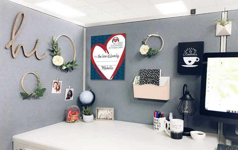 Standees for public areas and printed signs for desks were also created. Associates could personalize the experience by writing their own reason for 'Keeping Customers in Their Cars' and displaying it at their desks.
