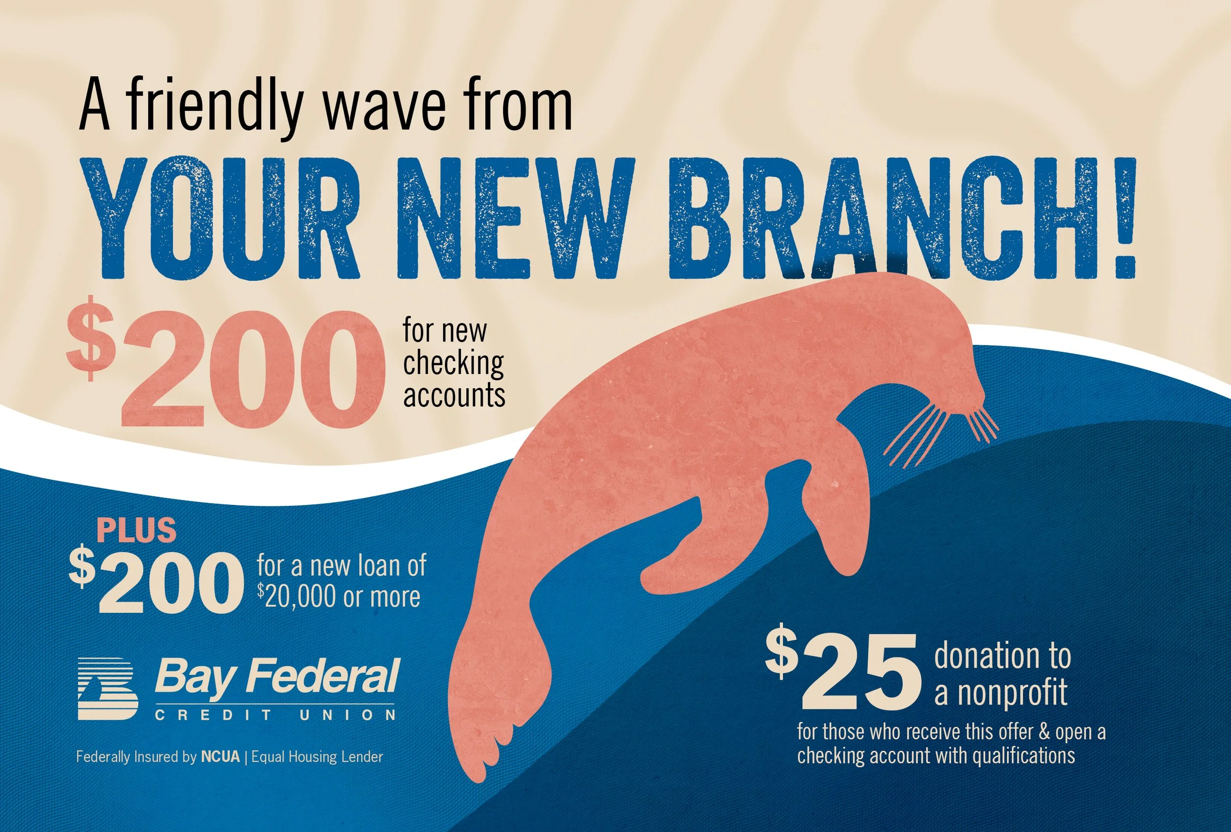 The Marina branch opening served as a full creative refresh for Bay Federal’s in-branch experience. I led and created the visual direction of the campaign, introducing a brighter, more graphic and community-oriented look that balanced modern design with the brand’s trusted legacy. From event signage and environmental graphics to digital and print materials, every element was crafted to celebrate local connection and invite members to feel at home in the new space.